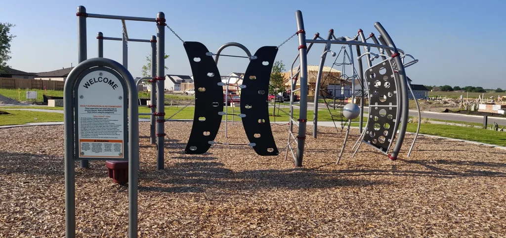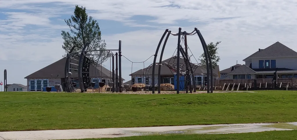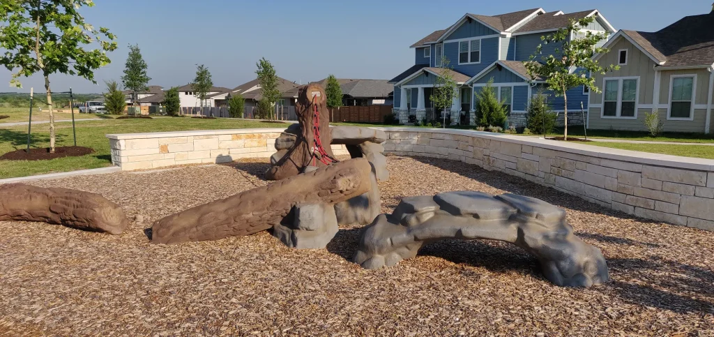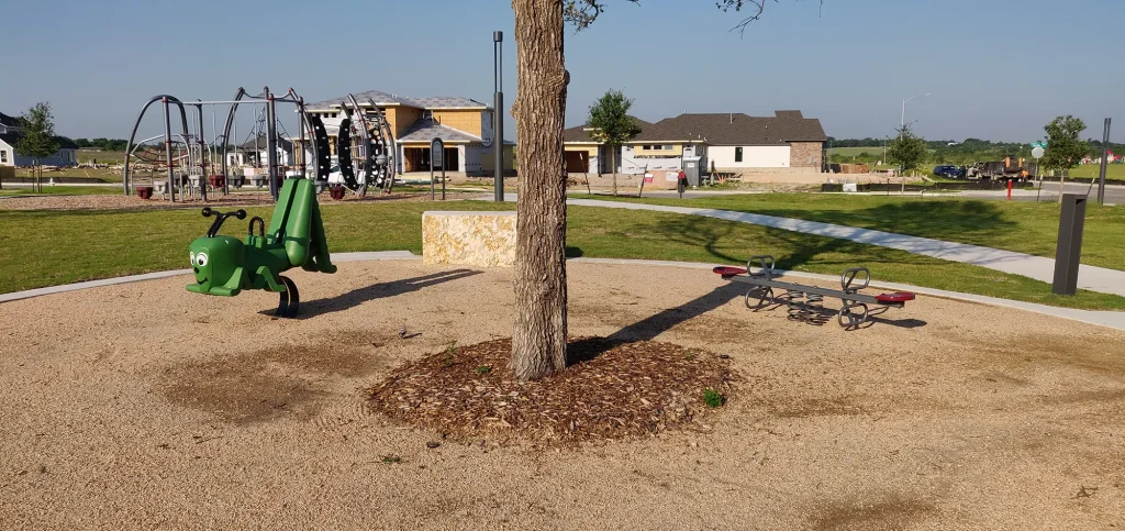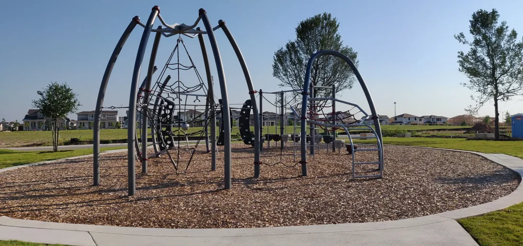 The pocket park, located at the southeast corner of Corrigan Pass and Chrysler Bend, will have trees and some charming play structures, including a climbing fort with a rope ladder and slide, as well as two large suspended nest swings.